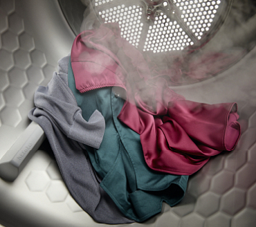 Технология SteamFinish - финальная обработка паром. В начале процесса сушки программа мягко распыляет воду в сотовый барабан, где она нагревается сухим воздухом. Пар заметно разглаживает белье. Для нейтрализации неприятных запахов можно добавить флакон с ароматом DryFresh